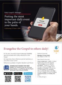“DGEMS” has the main purpose of helping our subscribers discover more clearly and experience more deeply these innate human longings. The reflections on the Daily Gospels are deliberately succinct and spiritually challenging. They are also meant to inspire and illuminate our daily experiences through God’s Word.