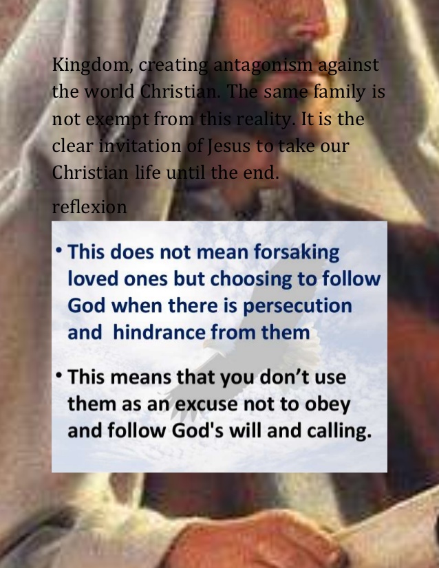 Jesus said that he came to bring not peace but the sword. He did not mean violence, but division and separation. His teachings and example would always provoke controversy, and many would resist. Jesus made it clear that we cannot put the expectations of society or family before our commitment to discipleship. Our Christian calling is not a part-time hobby but a way of life. If we cling to our own comfort and well-being, then we have missed the point.