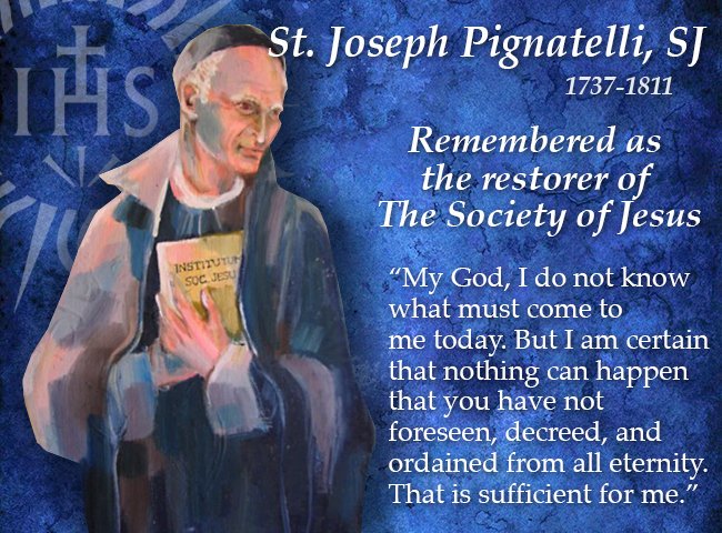 Fr Pignatelli died peacefully on November 15, 1811 without seeing the end of the 41-year suppression. However, his dearest hope of seeing the entire Society restored was realized when Pope Pius VII decreed it on August 7, 1814, three years after his death. Society of Jesus” died peacefully and serenely.