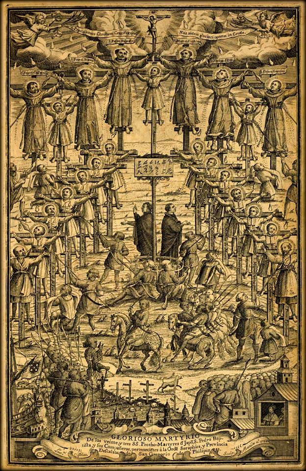 In the afternoon the four prisoners escorted by fifty soldiers and a large crowd of Christians made their way to the place of execution, with Fr Navarro chanting the Litany of Our Lady and his companions joyfully sang the responses. As they approached the shore, the martyrs saw the standing stakes awaiting them. The daimyo had instructed the soldiers to place the wood around the stakes so as not to prolong the prisoners’ suffering.