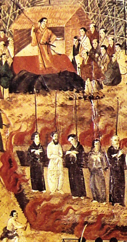 When fastened to his stake, Fr Spinola intoned the psalm, Praise the Lord, All You Nations, and the martyrs joined in a song of thanksgiving to God. The fires were lit but the wood was so arranged to prolong the victims’ suffering. Fr Spinola died within half an hour belonged he was greatly weakened after four years of imprisonment. Fr Kimura, endured his martyrdom for three hours and was the last to die, during which time he remained immobile with his arks outstretched in the form of a cross.